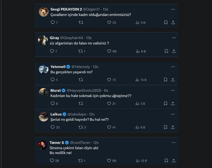 Yorumlarda “Türkiye’nin en bağnaz ve yobaz şehri Erzurum”, ” ilk gördüğümde köle pazarı sandım”, “Çuvallar içinde kaybolmuş kişilerin kadın olduğundan emin miyiz?”, “Bu nedir ya iyice Araplaştınız”, “Şeriat mi geldi?” gibi çirkin ifadeler yazıldı.